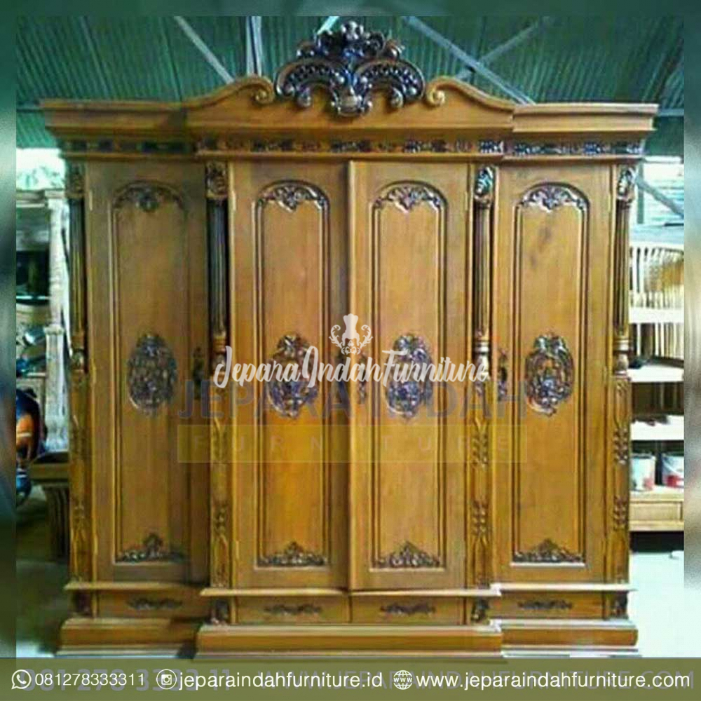 Lemari Pakaian 4 Pintu tersebut terbuat dari kayu jati yang berkualitas yang dapat anda letakkan pada kamar tidur anda atau ruangan lainnya yang dapat anda gunakan untuk tempat pakaian sekeluarga dikarenakan ukuran lemari 4 pintu ini sangat luas sehingga muat untuk menyimpan pakaian keluarga selain itu model ukiran antik ini membuat ruangan di rumah anda sangat mewah dan elegant.