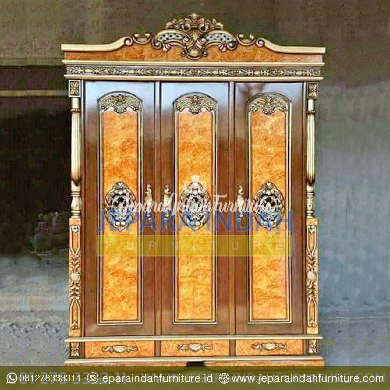 Lemari pakaian mewah yang mempunyai desain bergaya antik terbuat dari kayu jati. Ukiran yang cantik dan rapi membuatnya semakin tampil elegan dan megah. Lemari tempat penyimpanan pakaian cinta namanya, finishing natural untuk kayu jati kombinasi dengan warna gold emas atau marmer.
